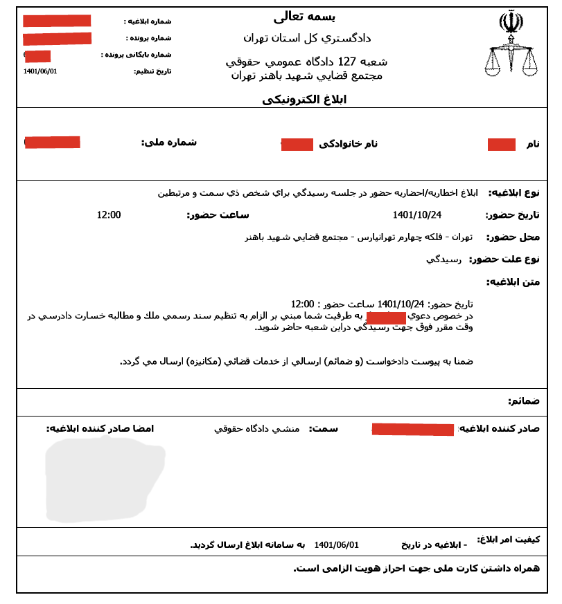 پس از ثبت دادخواست و ارجاع به شعبه، طرفین به موجب ابلاغیه زیر جهت حضور در جلسه رسیدگی دعوت شدند.