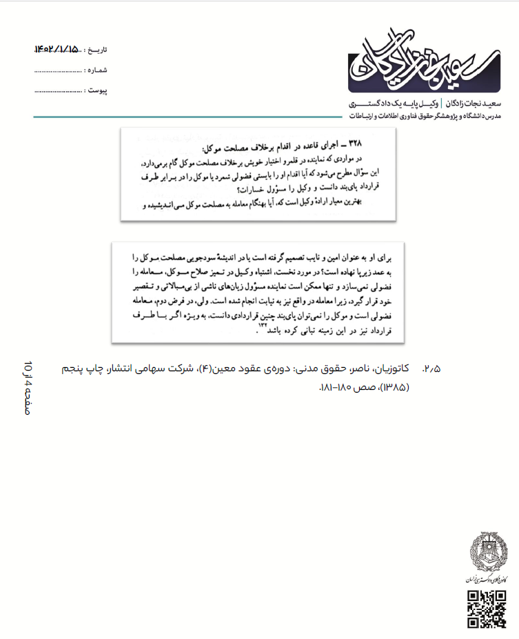 ماده ۱۰۷۴ قانون مدنی: حکم ماده فوق در موردی نیز جاری است که وکالت بدون قید بوده و وکیل مراعات مصلحت موکل را نکرده باشد.