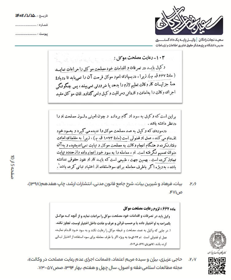ماده ۶۶۷ قانون مدنی: وکیل باید در تصرفات و اقدامات خود مصلحت موکل را مراعات نماید و از آنچه که موکل بالصراحه به او اختیار داده یا بر حسب قرائن و عرف و عادت داخل اختیار اوست تجاوز نکند.