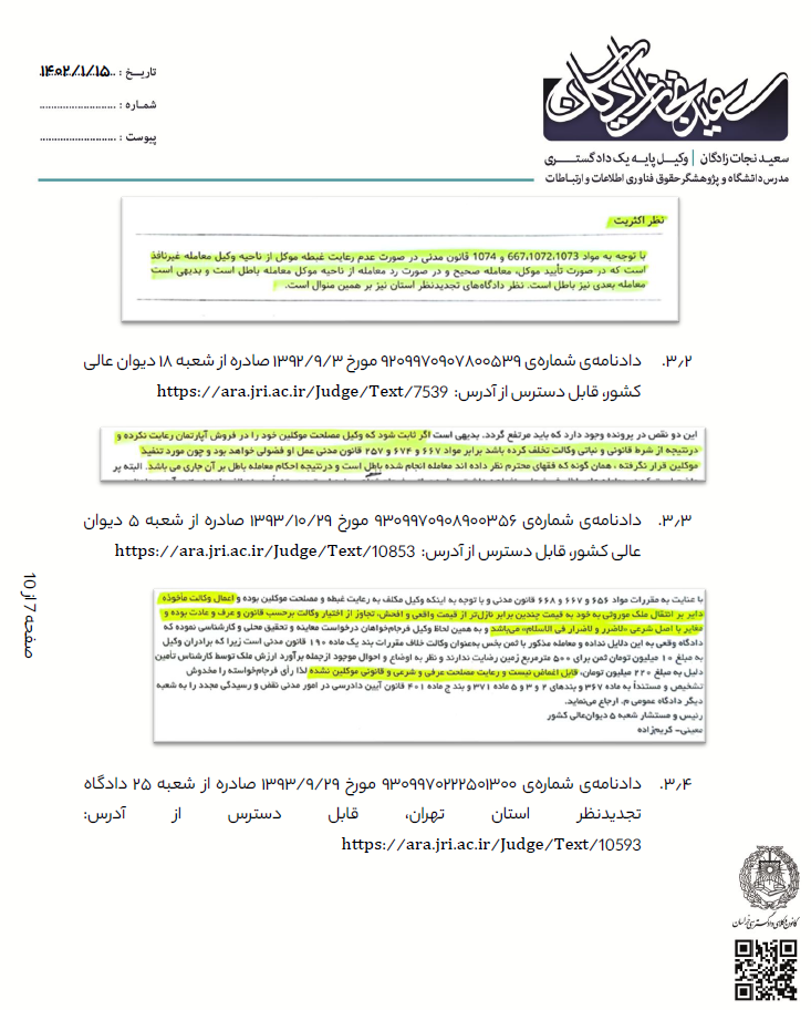 چکیده نظریه شماره ۷/۱۴۰۱/۹۷۳ مورخ ۱۴۰۱/۱۲/۲۱ اداره کل حقوقی قوه قضاییه درباره وکالت در فروش و معامله با خود: