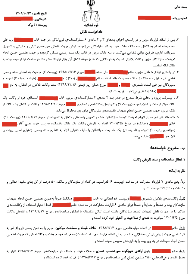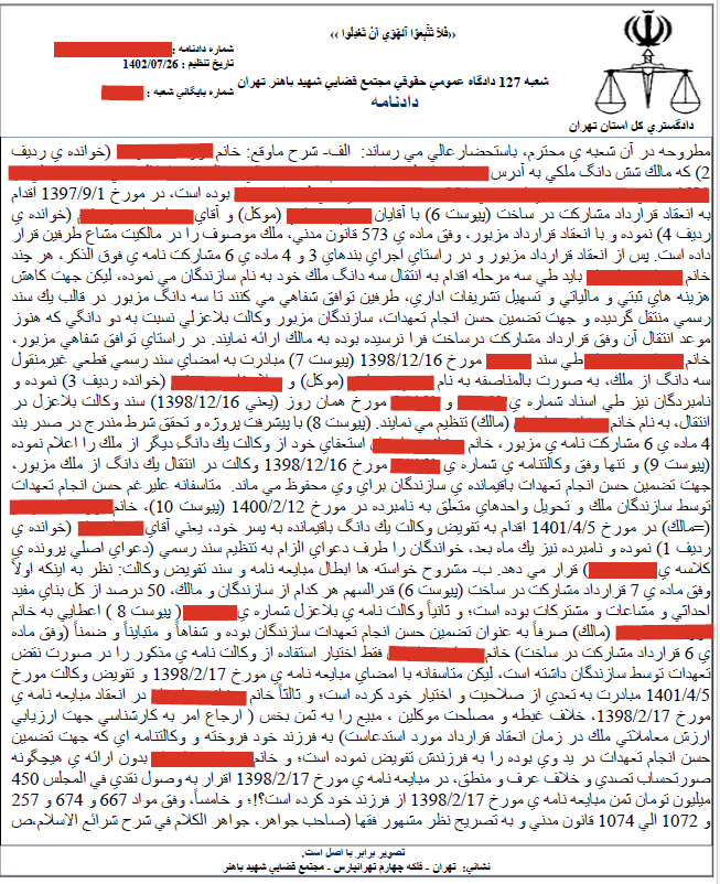 مادر محترم خواهان (خانم شیما) که مالک شش دانگ ملک متنازعفیه بوده است، در مورخ ۱۳۹۷/۰۹/۰۱ اقدام به انعقاد قرارداد مشارکت در ساخت با آقایان بهنام و آقای محمد (برادر خواندهی دیگر ) نموده و با انعقاد قرارداد مزبور، وفق مادهی ۵۷۳ قانون مدنی، ملک موصوف را در مالکیت مشاع طرفین قرار داده است.