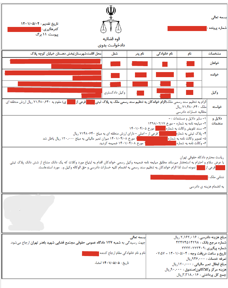 تاریخ دادخواست | 04/05/1401 | محل رسیدگی | مجتمع قضایی شهید باهنر-تهران |