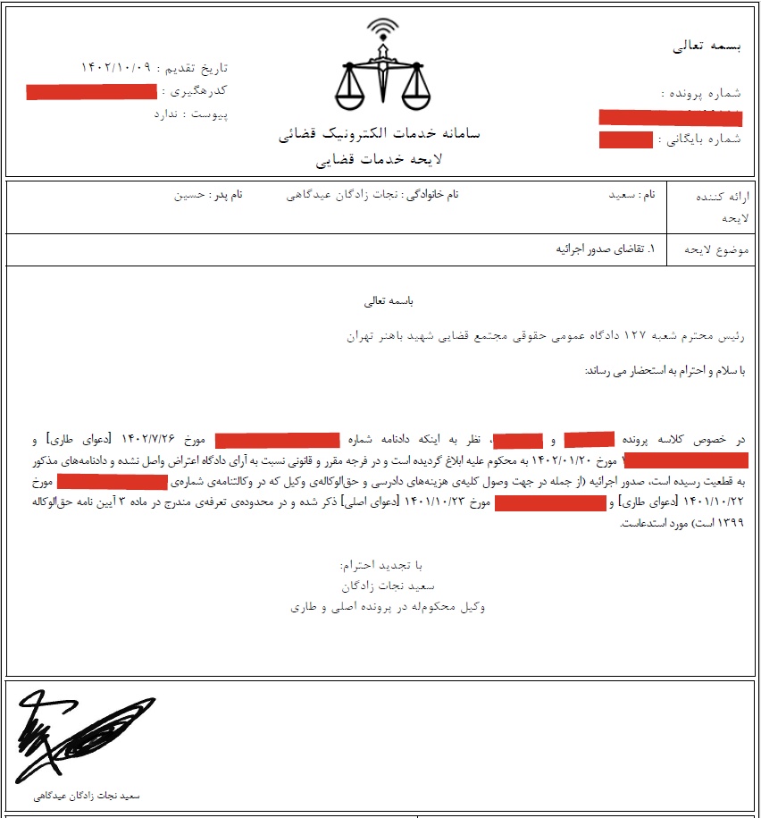 پس از قطعیت آرا دکتر سعید نجات زادگان به عنوان وکیل محکومله در پرونده دعوی اصلی و دعوی تقابل تقاضای صدور اجراییه به شرح زیر نمود:
