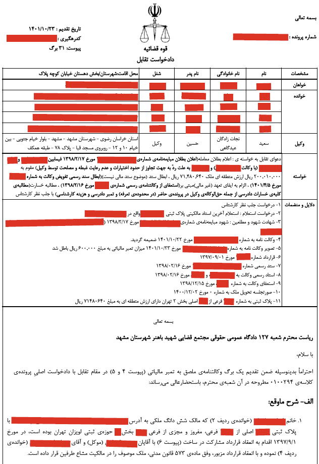 6- دادخواست تقابل وکیل سعید نجات زادگان