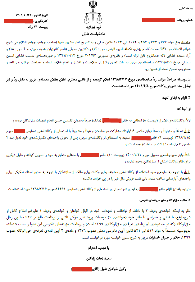 در تاریخ ۱۴۰۱/۱۰/۲۳ (یک روز پیش از تشکیل جلسه دعوی اصلی) دکتر سعید نجات زادگان به عنوان وکیل خوانده دادخواست تقابل را به شرح زیر به دادگاه تقدیم نمود: