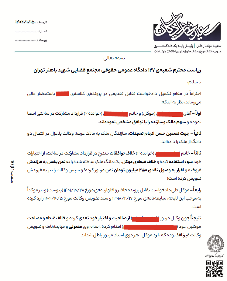 8- لایحه دکتر سعید نجات زادگان پس از دادخواست تقابل